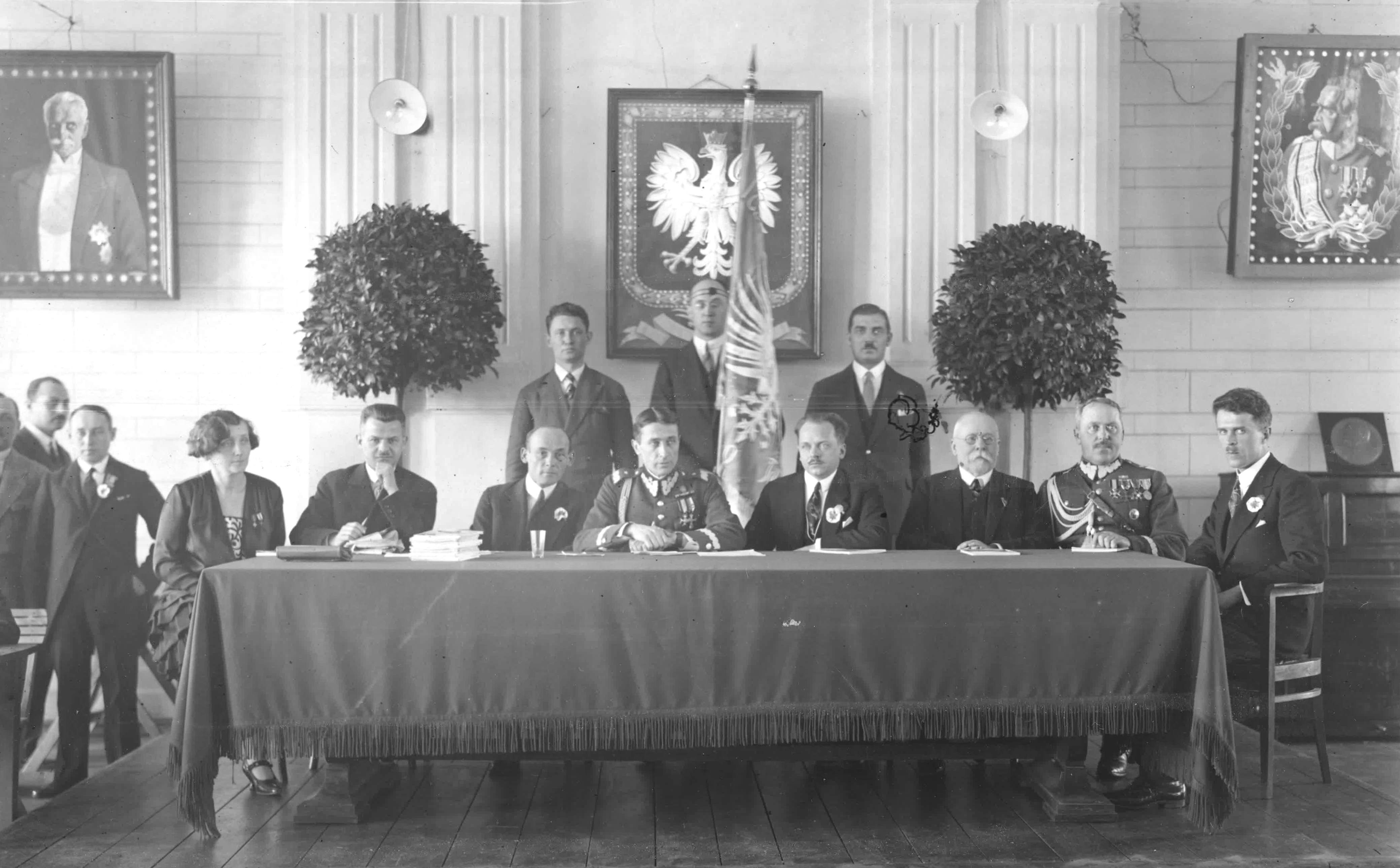 Zjazd Związku Peowiaków w Szkole Podchorążych w Alejach Ujazdowskich w Warszawie w marcu 1929 roku. share Podziel się facebook google + twitter linkedin clipboard envelope print quote picture add × Cytowane źródła Cytowanie źródła on-line, czyli Internetowego Polskiego Słownika Biograficznego Zjazd Związku Peowiaków w Szkole Podchorążych w Alejach Ujazdowskich w Warszawie w marcu 1929 roku., [online] Warszawa: Narodowy Instytut Audiowizualny [dostęp 26.02.2026]. Dostępny w internecie: http://www.biogramy.pl/a/foto/zjazd-zwiazku-peowiakow-w-szkole-podchorazych-w-alejach-ujazdowskich-w-warszawie-w-marcu-1929-roku Cytowanie wydania drukowanego, czyli Polskiego Słownika Biograficznego , Zjazd Związku Peowiaków w Szkole Podchorążych w Alejach Ujazdowskich w Warszawie w marcu 1929 roku., [w:] Polski słownik biograficzny, t. , IPSBID: ipsb-fo-75700 × Wyślij link do strony E-mail odbiorcy wiadomości: To pole jest wymaganeWpisz poprawny adres e-mail Twój adres e-mail: To pole jest wymaganeWpisz poprawny adres e-mail Podgląd wiadomości, która zostanie wysłana: Witaj, [Tutaj podany Twój e-mail] poleca Ci treść z iPSB (internetowym Polskim Słowniku Biograficznym) Zjazd Związku Peowiaków w Szkole Podchorążych w Alejach Ujazdowskich w Warszawie w marcu 1929 roku. × Dodaj do kolekcji wybierz kolekcję, do której chcesz dodać ten artykuł: lub wpisz nazwę nowej kolekcji, do której chcesz dodać ten artykuł: : To pole jest wymagane Dodaj do kolekcji Wybierz kolekcję Swoje kolekcje znajdziesz w profilu. Wystarczy kliknąć ikonę zębatego koła w górnym prawym rogu. Możesz je zobaczyć tu: moje kolekcje. × Dodaj do kolekcji Element został dodany do Twojej kolekcji. Swoje kolekcje możesz zobaczyć tu: moje kolekcje. × Dodaj do kolekcji Aby dodawać materiały do kolekcji musisz się zalogować. OPIS POSTACI POWIąZANE Prezydium zjazdu. Za stołem siedzą od prawej: Jan Pochowski, generał Henryk Krok-Paszkowski, pisarz Wacław Sieroszewski, poseł Marian Zyndram Kościałkowski, generał Julian Stachiewicz, Janusz Jędrzejewicz. Postaci powiązane Henryk Paszkowski (Krok-Paszkowski) 1887-04-01 - 1969-04-07 generał brygady WP Marian Kościałkowski (Zyndram-Kościałkowski) 1892-03-16 - 1946-04-12 premier II RP Julian Stachiewicz 1890-07-26 - 1934-09-20 działacz niepodległościowy Janusz Jędrzejewicz 1885-06-21 - 1951-03-16 premier II RP Wacław Kajetan Sieroszewski 1858-08-24 - 1945-04-20 powieściopisarz więcej >> Zobacz zdjęcie w najwyższej jakości Źródło