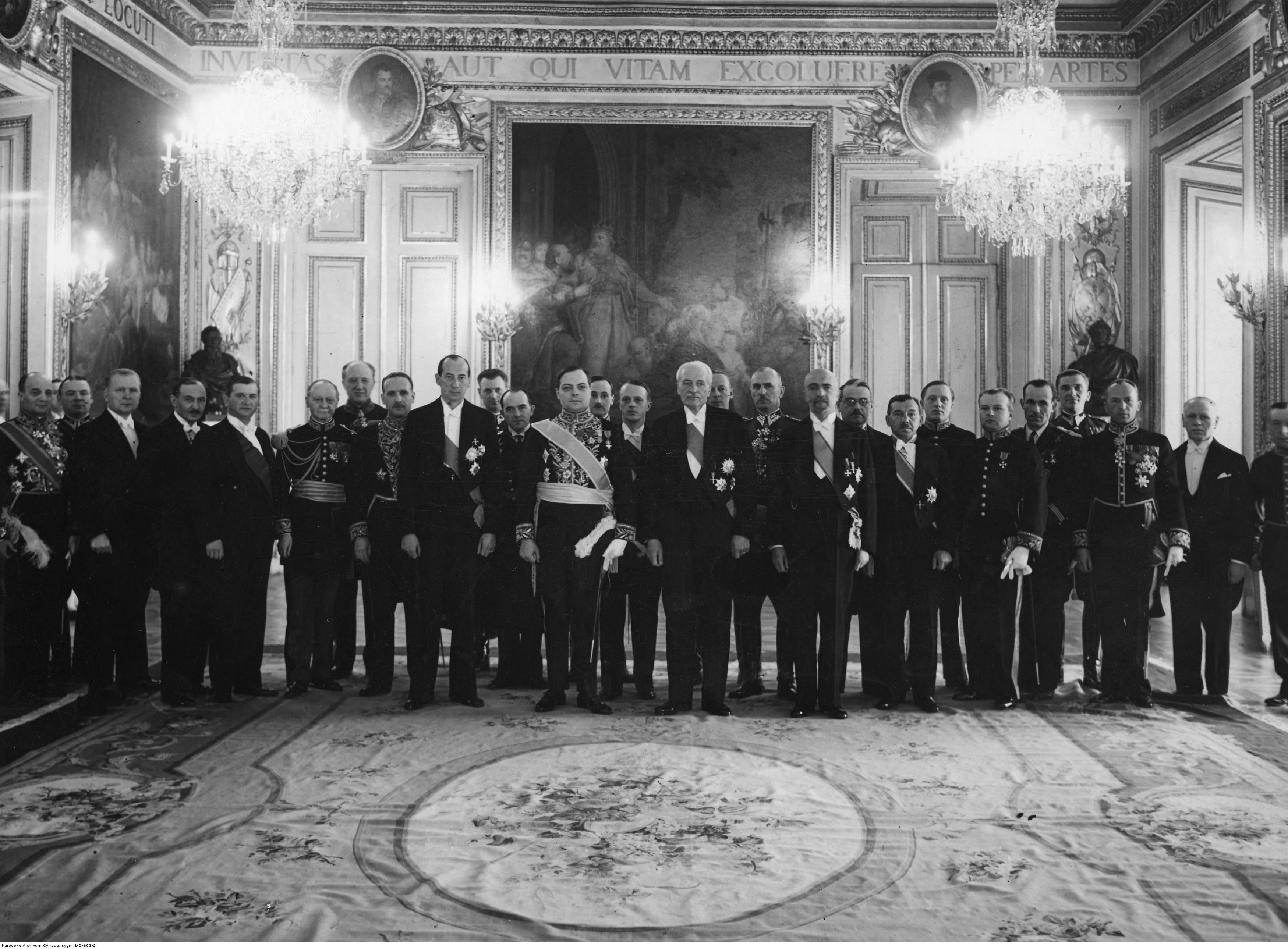 Ambasador Francji w Polsce Leon Noel (dwunasty z lewej) w towarzystwie prezydenta RP Ignacego Mościckiego (piętnasty z lewej) oraz polskich dyplomatów po złożeniu listów uwierzytelniających. Widoczni m.in.: minister spraw zagranicznych Józef Beck (dziewiąty z lewej), premier RP Walery Sławek (dziesiąty z prawej), szef Protokołu Dyplomatycznego MSZ Karol Romer (pierwszy z lewej), zastępca szefa Protokołu Dyplomatycznego MSZ Aleksander Łubieński (trzeci z lewej), szef Kancelarii Cywilnej Prezydenta RP Stanisław Świeżawski (czternasty z lewej), zastępca szefa Kancelarii Cywilnej Prezydenta RP Zygmunt Skowroński (dziewiąty z prawej), szef Gabinetu Wojskowego Prezydenta RP płk Jan Głogowski (jedenasty z prawej), francuski attache wojskowy Charles d'Arbonneau (szósty z lewej), kpt. Józef Hartman (dziesiąty z lewej) oraz kpt. Zygmunt Gużewski (szesnasty z lewej).