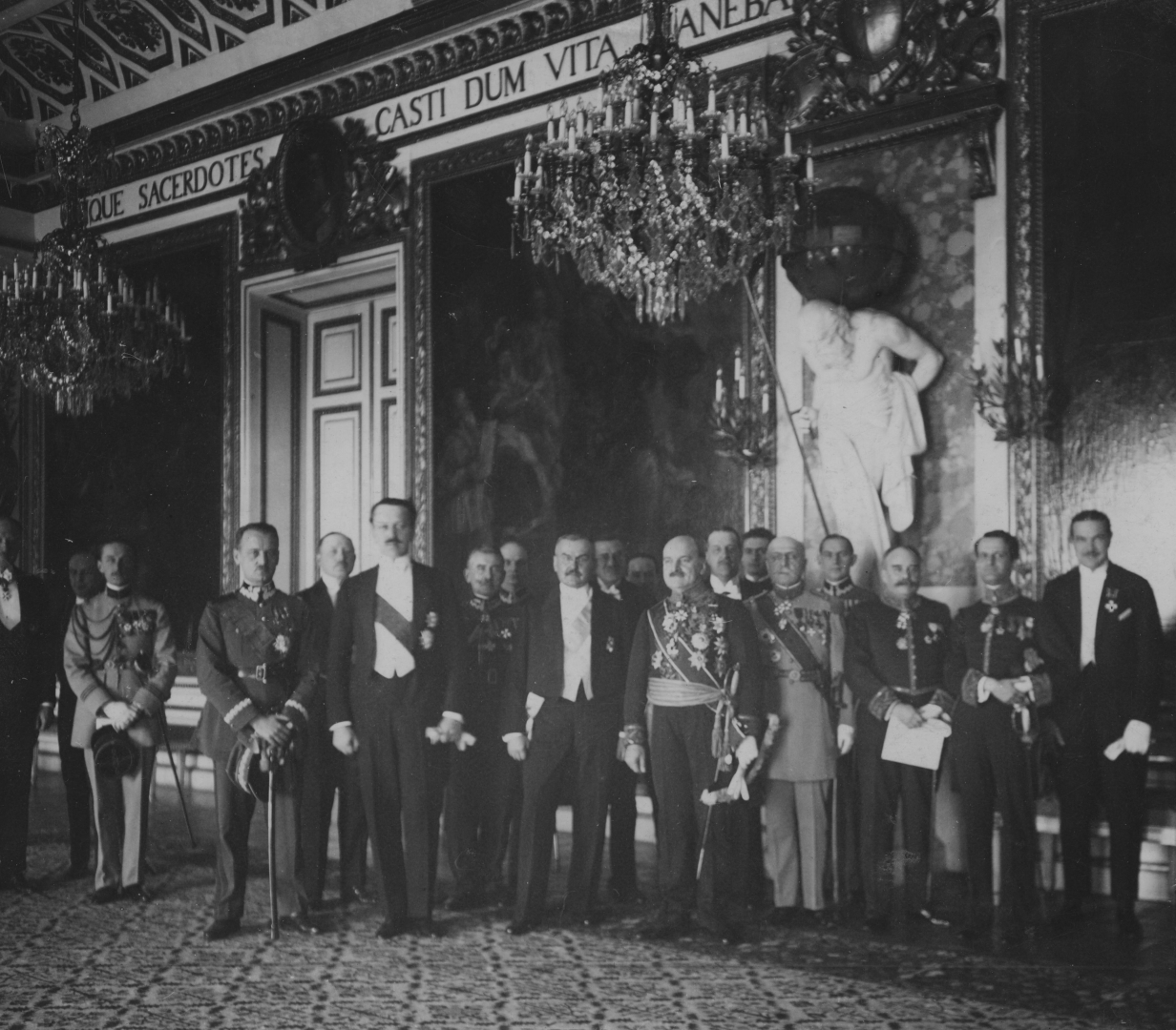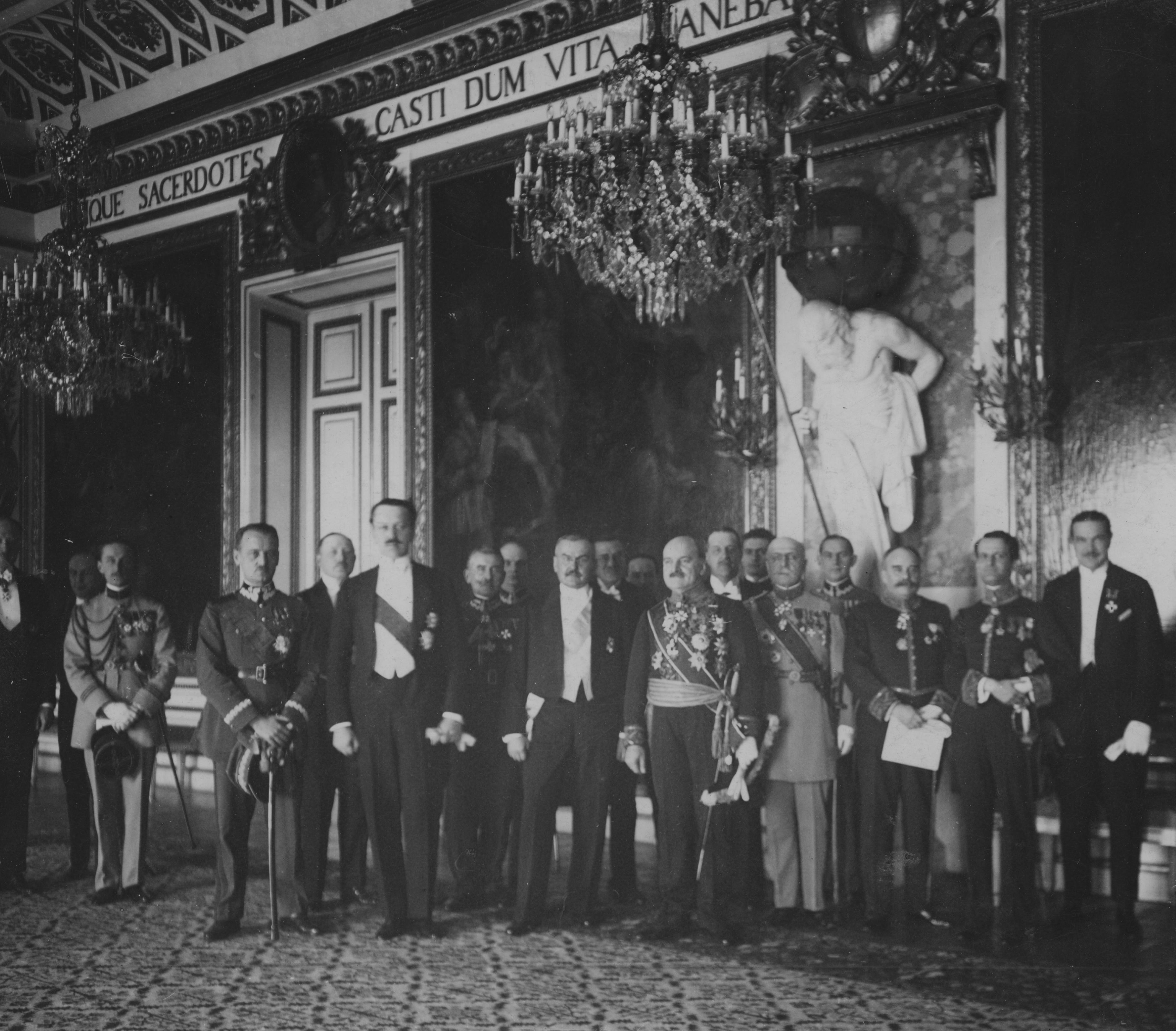 Ambasador Francji w Polsce Hector Andre de Panafieu (ósmy z prawej) w sali rycerskiej Zamku Królewskiego w towarzystwie polityków i dyplomatów po złożeniu listów uwierzytelniających prezydentowi RP Stanisławowi Wojciechowskiemu. Widoczni m.in.: generał Władysław Sikorski (czwarty z lewej), minister spraw zagranicznych Polski Aleksander Skrzyński (szósty z lewej), generał Mariusz Zaruski (siódmy z lewej), prezes Rady Ministrów Władysław Grabski (dziewiąty z lewej), szef Kancelarii Cywilnej Prezydenta RP Konstanty Lenc (dziesiąty z lewej), szef Protokołu Dyplomatycznego MSZ Stefan Przeździecki (siódmy z prawej), szef francuskiej misji wojskowej generał Edmont Dupont (piąty z prawej).