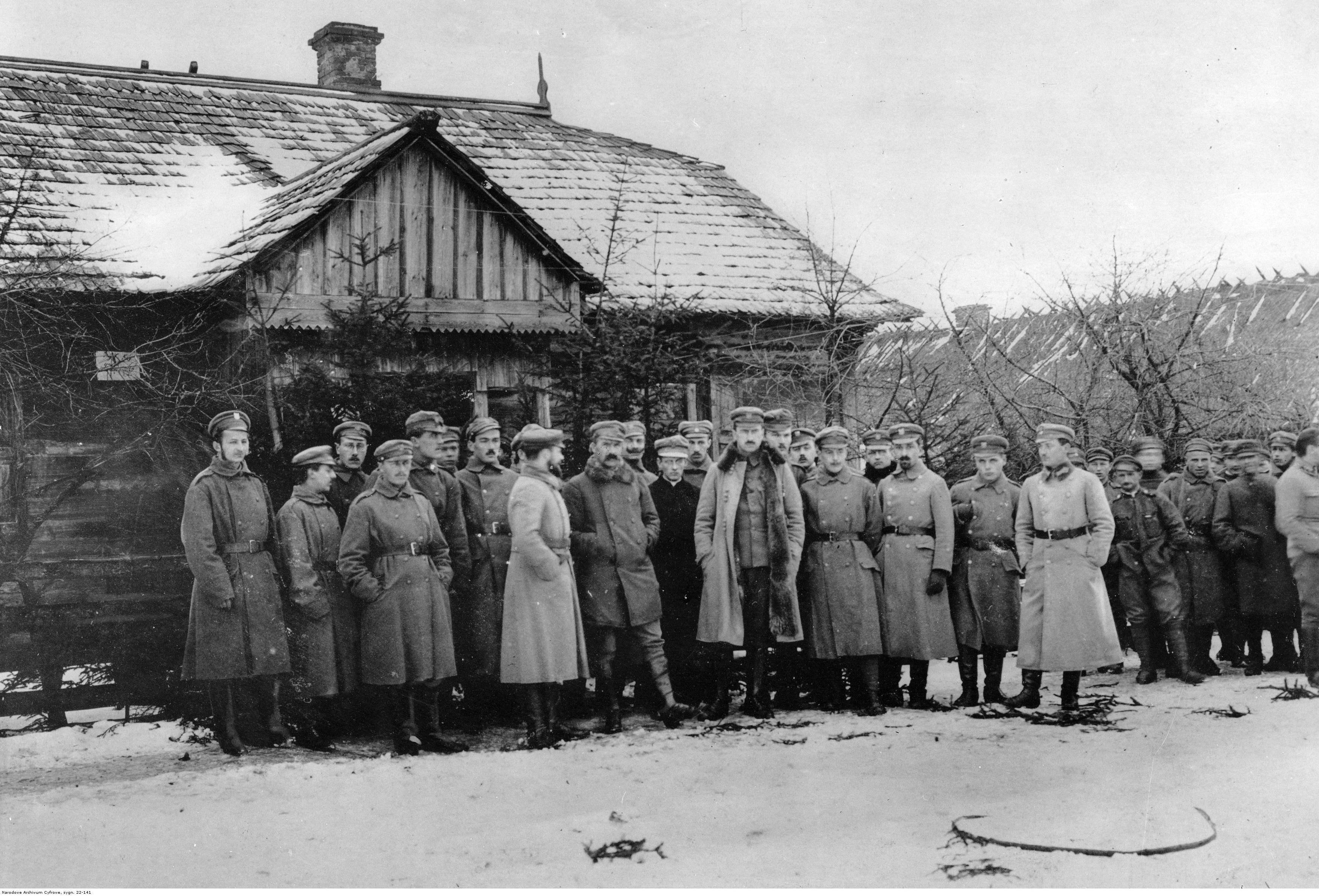 Składanie życzeń noworocznych Piłsudskiemu. Widoczni od lewej (poza Piłsudskim): Bekert, Michał Grossek, Leon Grot, Franciszek Dubiel, porucznik 1 pułku piechoty I Brygady Legionów Polskich, Adolf Poręba-Porębski, Rudolf Maćko-Złom, Edward Zinth-Rzecki, oficer 6 batalionu I Brygady, Żymirski, Składkowski, ks.Stanisław Żytkiewicz, kapelan 5 pułku piechoty I Brygady Legionów, Świtek, mjr Albin Fleszar ps. "Satyr", oficer 6 batalionu I Brygady Legionów, Kababiński, Stanisław Parczyński ps. "Młot", Kazimierz, Mały, Tadeusz Majewski, Rokita-Maksymowicz, porucznik 5 pułku piechoty I Brygady Legionów (ostatni z prawej).
